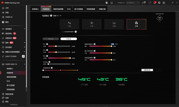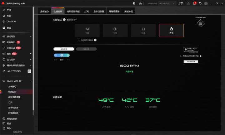 当然本文着重于大师模式。其实对于大部分用户来说,狂暴模式,就可以满足大部分的重负载场景,并通过智能的功耗分配,也可以达到OMEN暗影精灵MAX的最高250W的满功耗性能,广大用户可以按需选择。