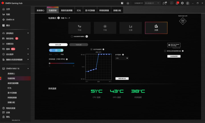 打开Omen Gaming Hub后,在性能控制选项中便可以看到大师模式的入口。进入大师模式后有两个选项,“散热设置”和“电源设置”。