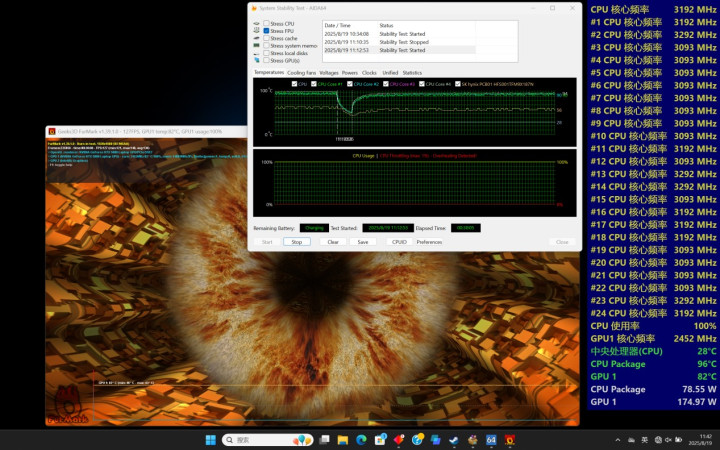 先来用最为直观的双烤测试来看下我们调整的大师模式下的表现。双烤测试使用AIDA 64 Stress FPU+Furmark 1920*1080 8xMSAA进行,时间30分钟。CPU功耗75W左右,全核心频率也都在3.1~3.2GHz左右,温度96度;GPU功耗175W左右,频率2450MHz左右,温度82度。