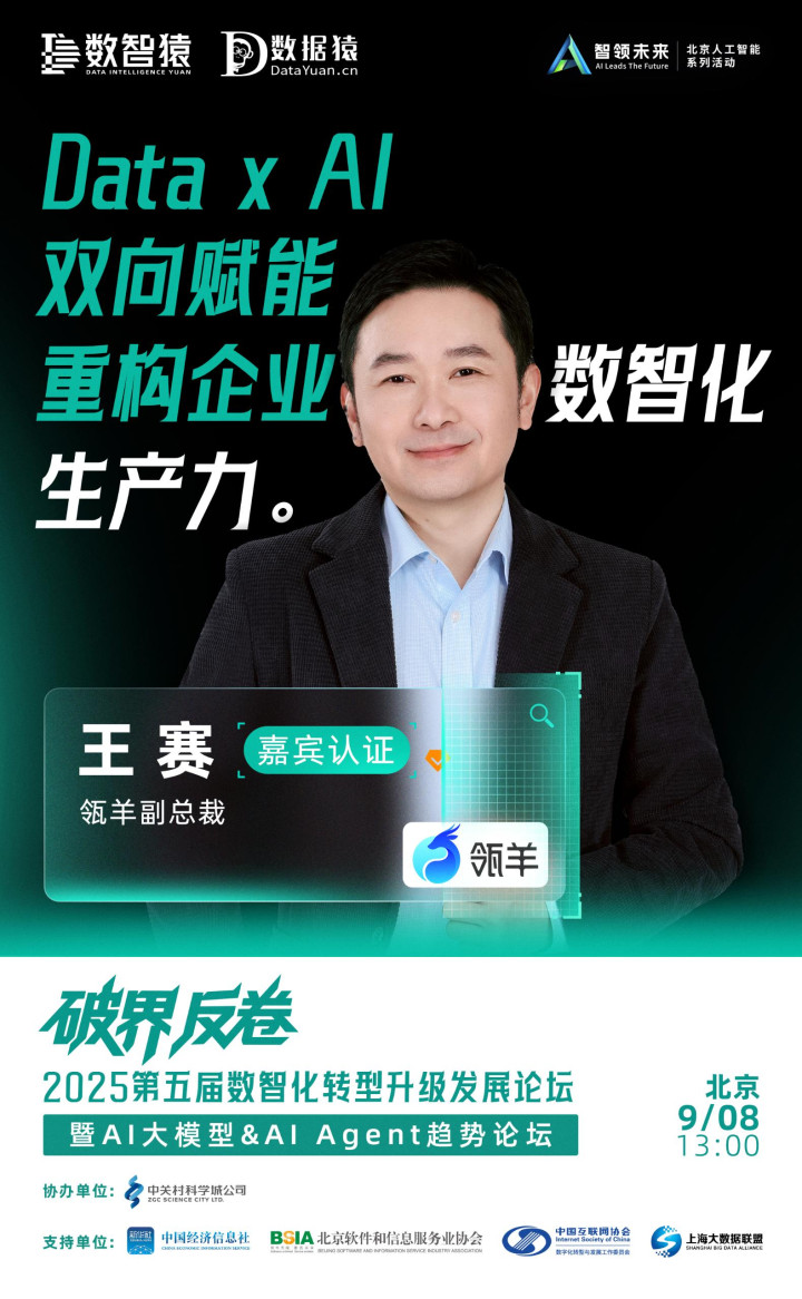 瓴羊副总裁王赛,已确认出席由数智猿×数据猿联合主办,中关村科学城公司协办,新华社中国经济信息社×北京软件和信息服务业协会×中国互联网协会数字化转型与发展工作委员会×上海大数据联盟作为支持单位的的“2025第五届数智化转型升级发展论坛——暨AI大模型&AI Agent趋势论坛”。